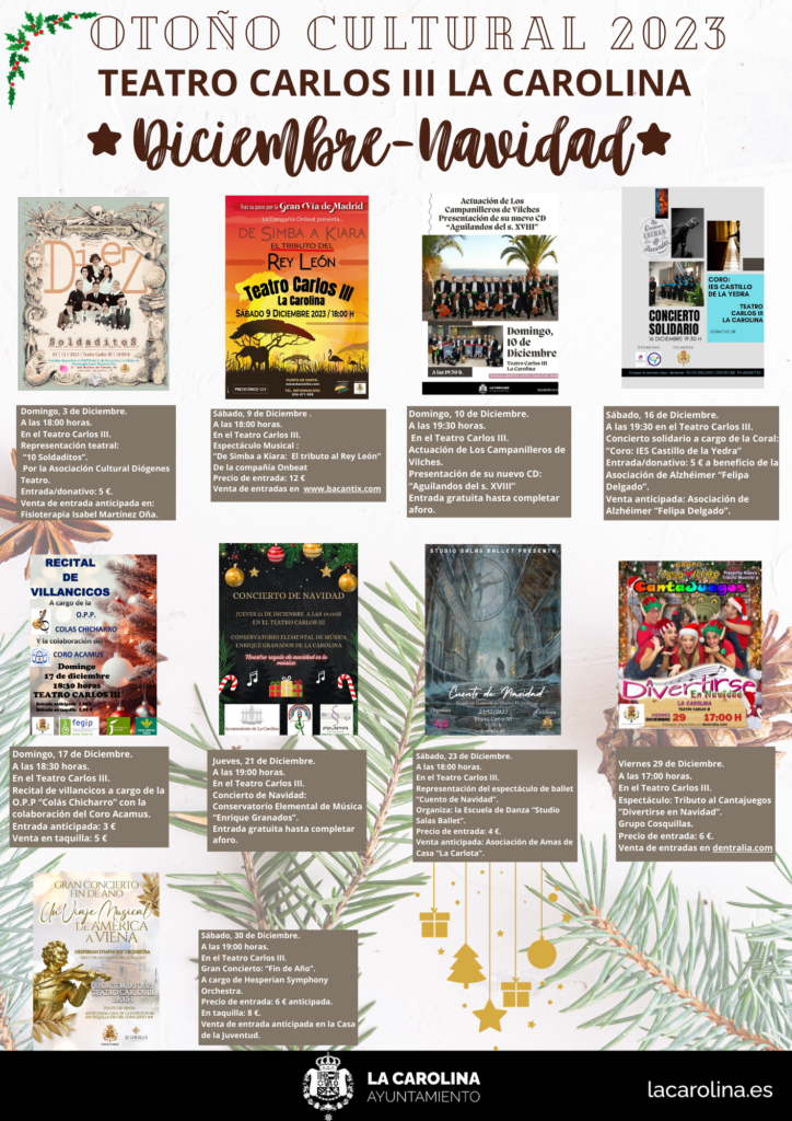 Por este motivo, el mes de Diciembre ha de ser especial, más aún con la época que ya está tocando a la puerta: la Navidad. Podrán disfrutarse de espectáculos de danza como «Cuento de Navidad«, inspirado en la famosa obra de Charles Dickens. A cargo de la escuela de danza local «Studio Salas Ballet«. También el Gran Concierto “Fin de Año, a cargo de Hesperian Symphony Orchestra y más eventos.