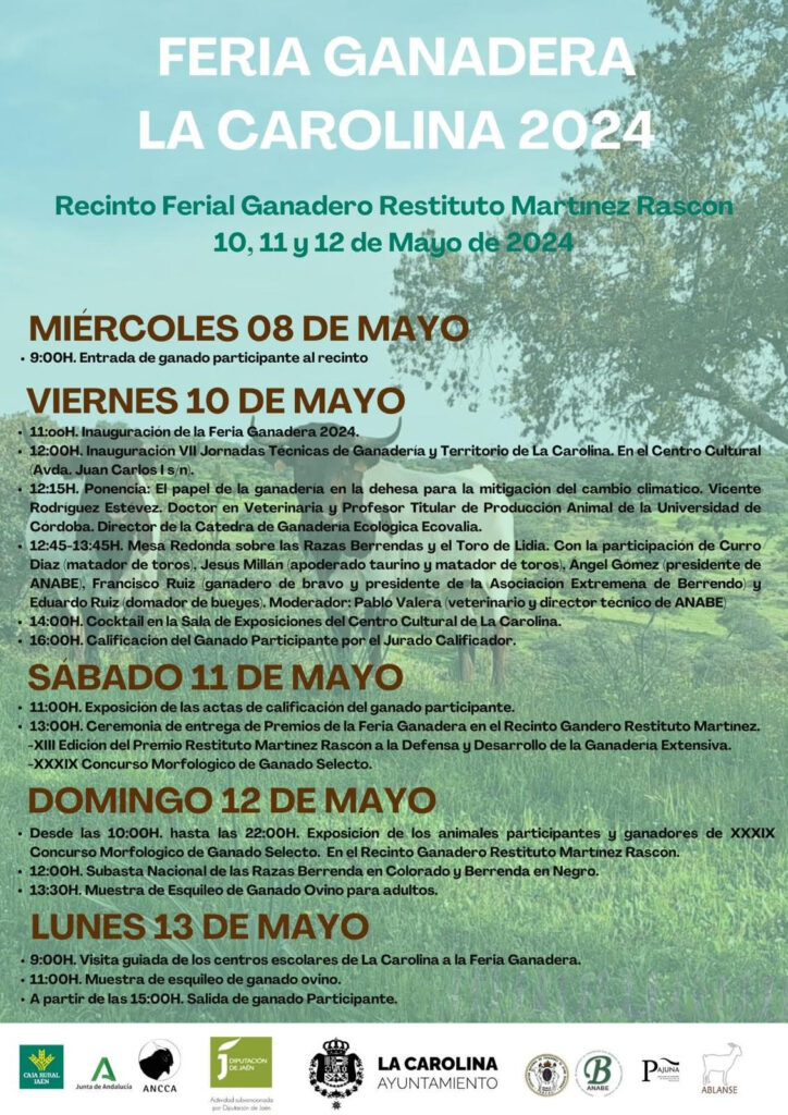 Se destaca la jornada del viernes día 10 de mayo, ya que es la inauguración de la Feria Ganadera a las 11:00 horas. Posteriormente, tendrá comienzo las «VII Jornadas Técnicas de Ganadería y Territorio de La Carolina» en el Centro Cultural. Aquí se llevará a cabo una interesante ponencia titulada: «El papel de la ganadería en la dehesa para la mitigación del cambio climático», por Vicente Rodríguez Estévez, Doctor en Veterinaria y Profesor Titular de Producción Animal de la Universidad de Córdoba y Director de la Cátedra de Ganadería Ecológica Ecovalia.