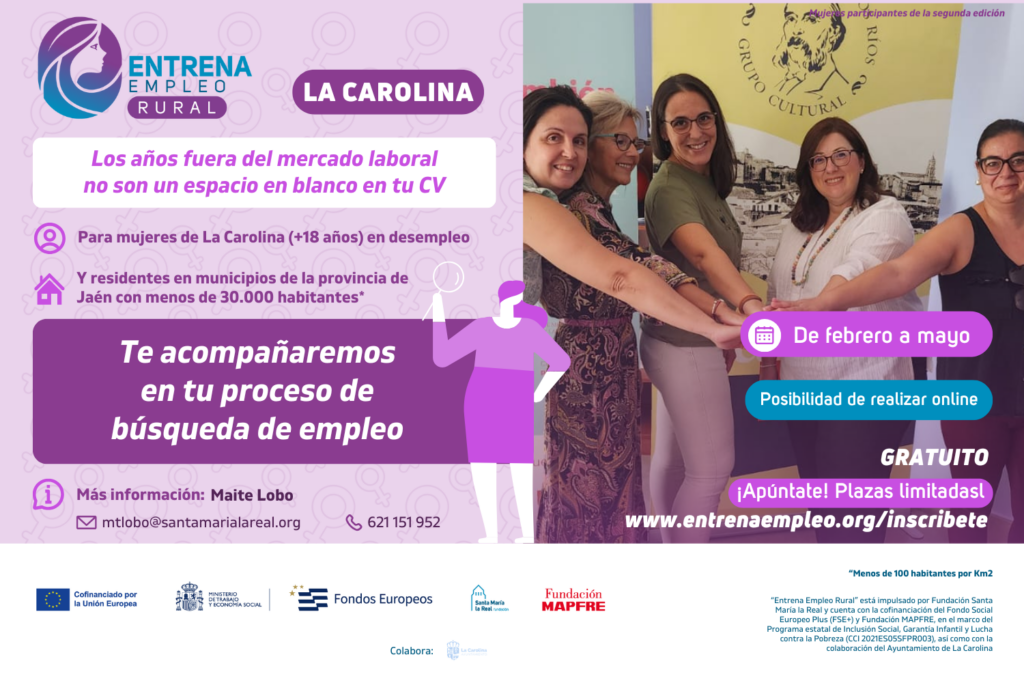 Entrena Empleo Rural” es el programa gratuito de orientación laboral que guía a mujeres en desempleo en diferentes municipios de menos de 30.000 habitantes de España a reactivar su búsqueda de trabajo con nuevas técnicas y herramientas digitales para fomentar su inserción. A partir de febrero se pondrá en marcha una nueva edición en diferentes puntos de España, entre ellos La Carolina.