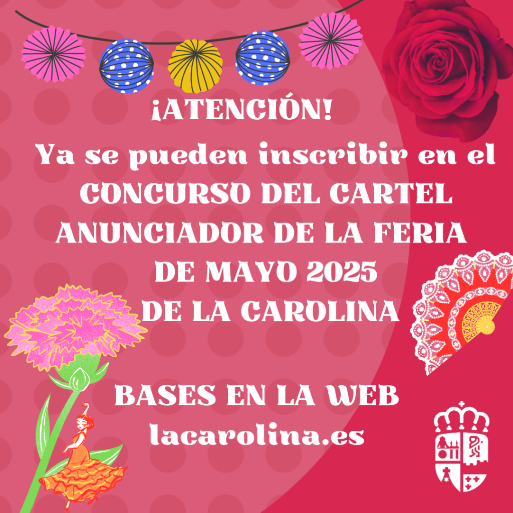 El Excmo. Ayuntamiento de La Carolina anuncia desde hoy las BASES para el Concurso del Cartel Anunciador de la Feria de Mayo 2025. Un concurso en el que podrán tomar parte todos/as los/as artistas profesionales y aficionados/as, nacionales o extranjeros/as que lo deseen, sin limitación en cuanto al número de obras a presentar.