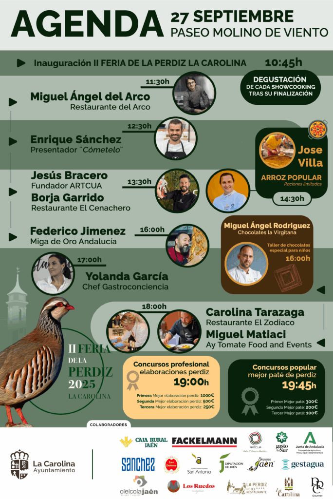 El Ayuntamiento de La Carolina ha presentado hoy la programación de la II Feria de la Perdiz, un evento gastronómico, cultural y turístico que se celebrará el próximo 27 de septiembre en el Paseo Molino de Viento, consolidándose como una cita de referencia en el calendario provincial.